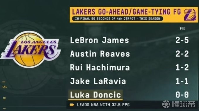 据统计,湖人本赛季在第四节最后90秒的扳平或反超球出手: