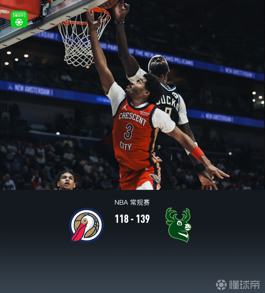 北京时间2月21日NBA 常规赛,新奥尔良鹈鹕对阵密尔沃基雄鹿。半场鹈鹕65-71雄鹿,最终鹈鹕118-139雄鹿。