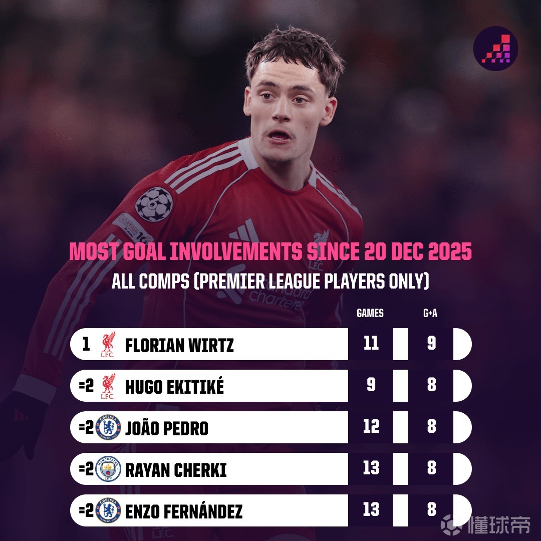 11场6球3助攻,维尔茨是近1个半月参与进球最多的英超球员 足球新闻 2026-02-07 01:46 维尔茨在上一轮英超传射建功,帮助利物浦4-1大胜纽卡。数据统计显示,这位德国球星是近一个半月在各项赛事直接参与进球最多的英超球员。2025年12月20日,维尔茨在对阵热刺的比赛中斩获首次英超助攻,此后这名德国攻击中场延续出色的发挥,在近11场比赛里贡献6球3助攻,直接参与9球,这是英超球员同期最高数据。去年12月20日以来英超球员参与进球排名维尔茨 11场参与9球埃基蒂克 9场参与8球若昂-佩德罗 12场参与8球谢尔基 13场参与8球恩佐-费尔南德斯 13场8参与8球 上一条:ESPN:巴萨计划与莱万商讨大幅降薪续约,球员仍可能留队 下一条:记者疯狂挖坑!本泽马:比赛,只聊比赛!为何不告而别你去问他们