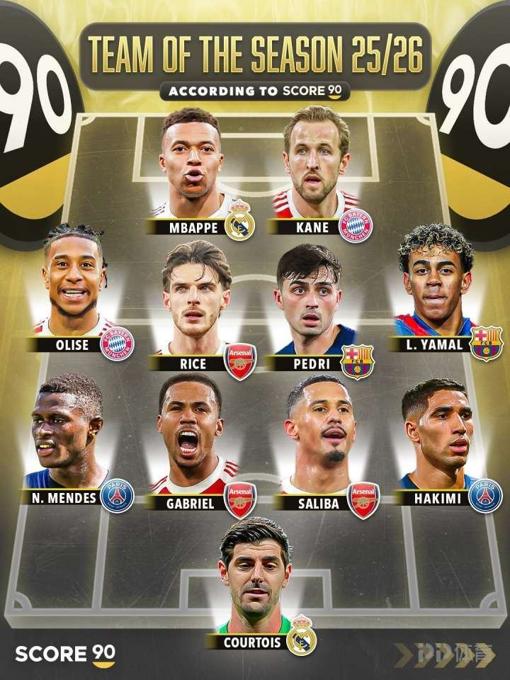 外媒Score90近日评选出25/26赛季截止至今的最佳阵容,其中阿森纳3人入选,皇马、巴萨、拜仁、巴黎各2人入选。