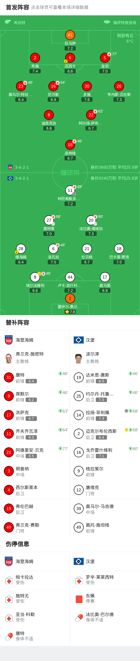 汉堡2-0海登海姆,柯尼希斯多费尔建功,拉扬-菲利佩锦上添花 足球新闻 2026-02-09 01:43 北京时间2月7日德国足球顶级联赛 联赛 第21轮,海登海姆主场对阵汉堡。汉堡柯尼希斯多费尔破门,拉扬-菲利佩破门。最终比分海登海姆 0-2 汉堡。点击查看本场比赛详细数据>>点击查看德甲完整积分榜>>精彩瞬间上半场补时第3分钟,汉堡球员奥特莱助攻柯尼希斯多费尔打入一球。第78分钟,汉堡球员法比奥-维埃拉助攻拉扬-菲利佩打入一球。 球队阵容 技术统计 上一条:阿斯:德容缺席马洛卡因腹股沟不适,但出战马竞应该没有问题 下一条:哈格里夫斯:B费在曼联中场是独一档的 姆伯莫让我想到了萨拉赫