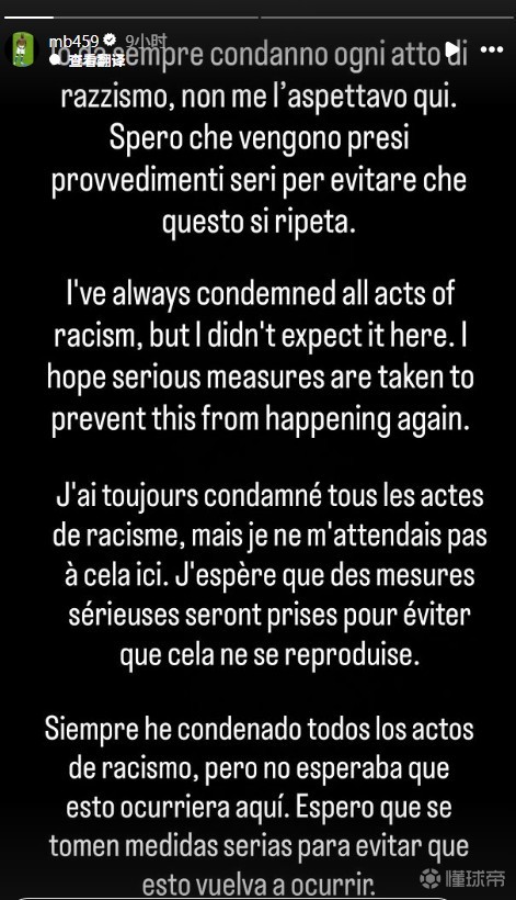 在阿联酋比赛时遭遇种族歧视,巴洛特利:不能容忍这种行为 足球新闻 2026-02-13 01:34 北京时间2月12日凌晨,巴洛特利在社交媒体上发表动态,控诉自己在阿联酋遭遇种族歧视。巴洛特利表示,他在对阵迪拜城的比赛中遭遇了种族歧视:“今天,在一场比赛中,我多次成为种族歧视侮辱的对象,有人多次对我说:‘呜呜呜,去吃香蕉吧’。在足球或社会中,绝对没有种族歧视的容身之地。”“这种行为不能被正常化、合理化或忽视。我想公开谈论这件事,以提高公众的意识,不仅仅是为了我自己,也为了每一个遭受过这种对待的球员,够了。” 上一条:孔帕尼:我们本可进更多球 拜仁全员健康在未来两个月是巨大优势 下一条:三场踢了13-1!海纳:莱比锡显然是强队 拜仁一直梦想重夺德国杯