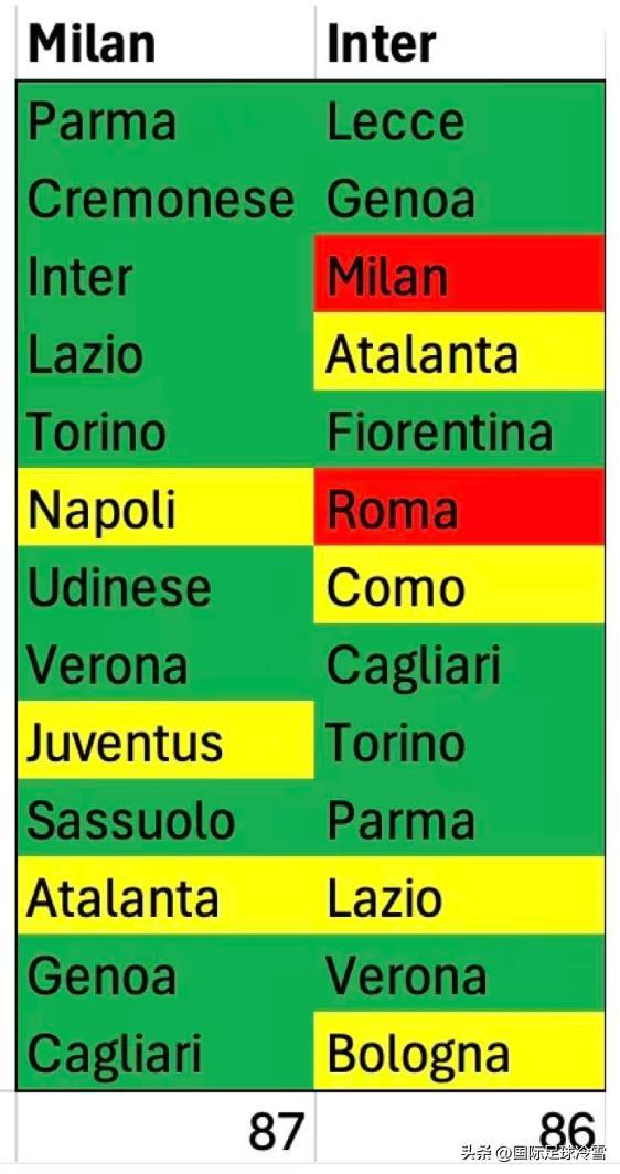 如今,不少意媒都在帮AC米兰算分,认为国米“肯定掉链子”,最终AC米兰能以1分优势夺冠。