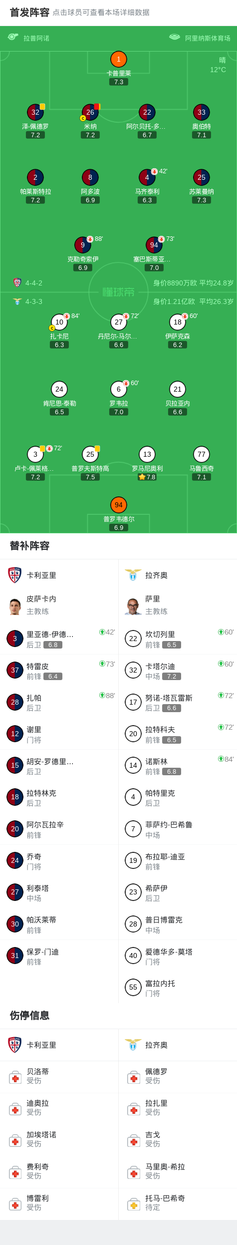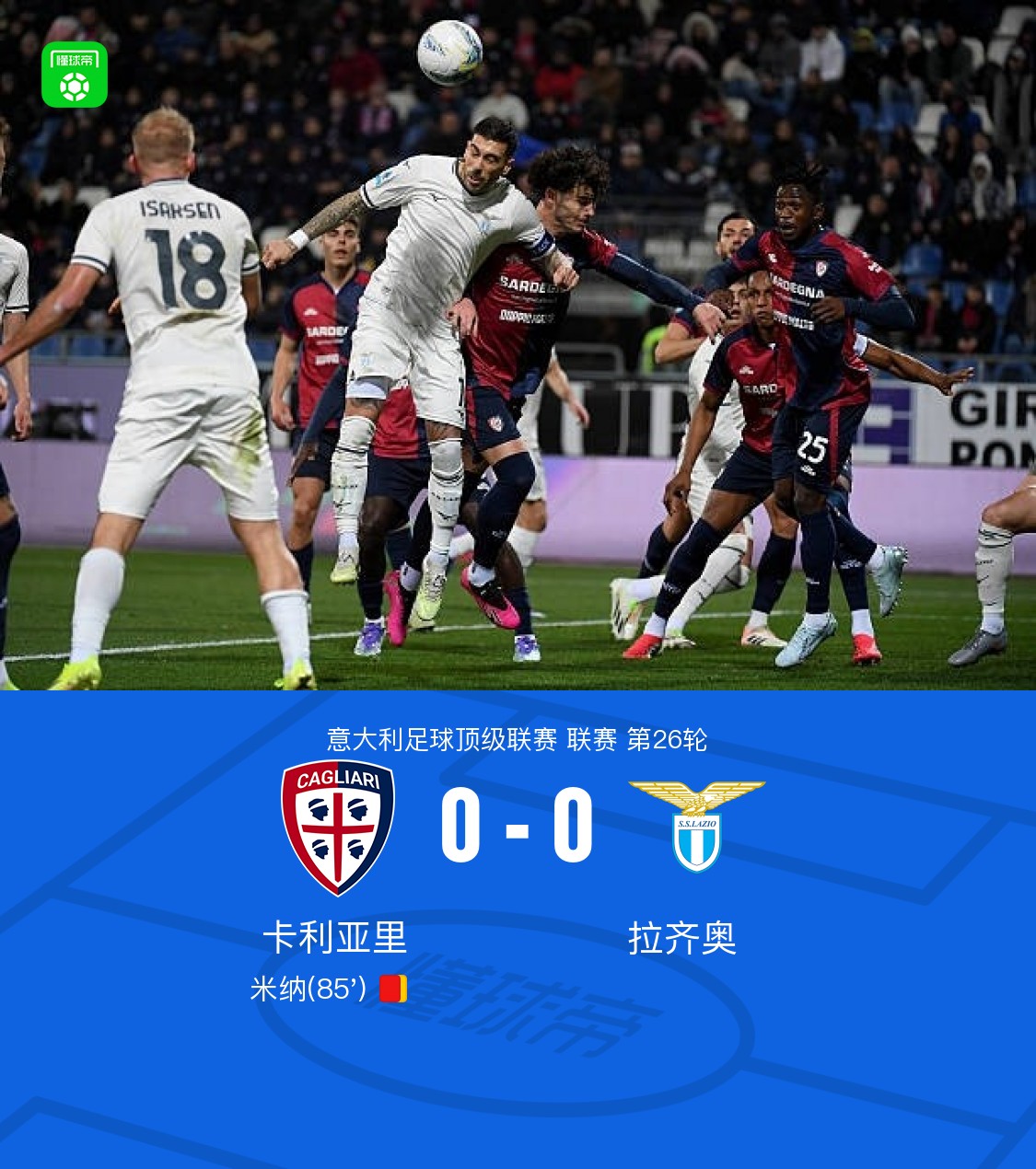 北京时间2月22日意大利足球顶级联赛 联赛 第26轮,卡利亚里主场对阵拉齐奥。最终比分卡利亚里 0-0 拉齐奥。