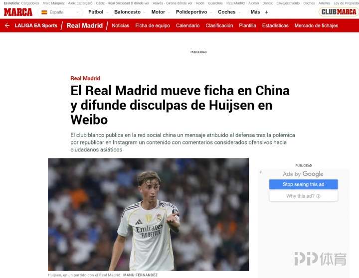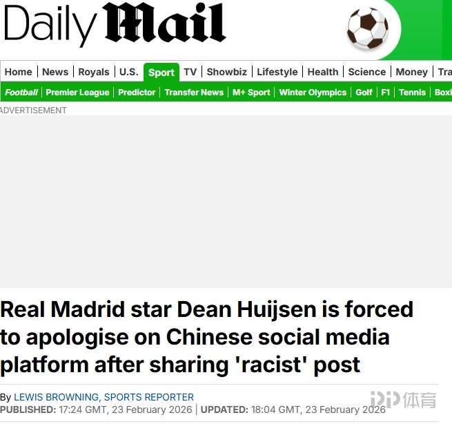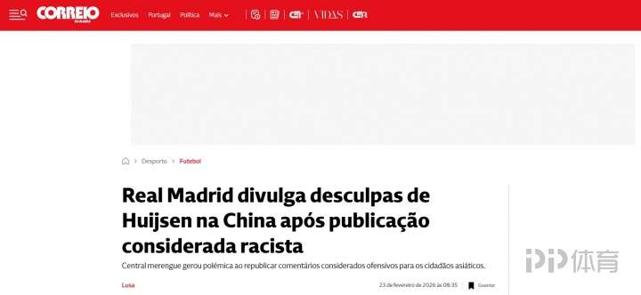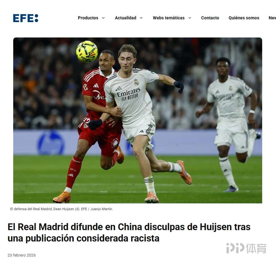 全球关注皇马后卫赫伊森事件!西班牙、葡萄牙、英国等媒体跟进报道 足球新闻 2026-02-25 01:37 北京时间2月21日,皇马后卫赫伊森的ins账号转发了一条动态,该动态的首张图片有明显的辱华意味。首张图片的高赞评论写道:“就算是中国人也会叫他中国人”,“用牙线就能蒙住他的眼睛”。该事件迅速发酵,此后赫伊森将该转发内容删除。皇马官方微博发布赫伊森“特供版”道歉内容,被批没有诚意。环球时报英文版率先关注赫伊森事件,目前有包括西班牙官方通讯社埃菲社、马卡报、阿斯报;英国邮报、葡萄牙晨邮报等媒体跟进报道。 责任编辑: 体育24小时热点 上一条:ESPN:巴萨将签16岁英格兰边锋塔瓦雷斯,球员会先加入U19梯队 下一条:每体:巴萨边卫巴尔德逐渐在队内边缘化,弗里克更偏爱坎塞洛马丁