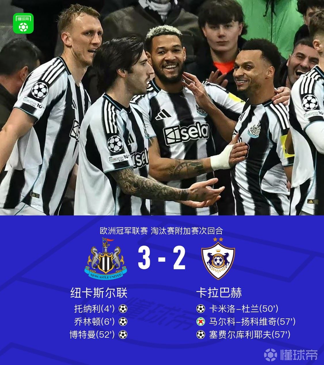 北京时间2月25日欧洲冠军联赛 淘汰赛附加赛次回合,纽卡斯尔联对阵卡拉巴赫。纽卡斯尔联托纳利破门,乔林顿破门,博特曼破门。卡拉巴赫卡米洛-杜兰破门,塞费尔库利耶夫破门。最终比分纽卡斯尔联 3-2 卡拉巴赫。两回合总比分纽卡斯尔联9-3卡拉巴赫。