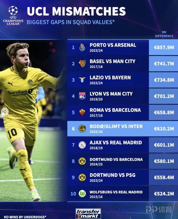 德转统计了欧冠淘汰赛以弱胜强身价差距最大榜。本赛季博德闪耀的身价比国米少6.102亿欧,却战胜对手晋级,排名榜单第六位。排名榜首的是波尔图在23/24赛季淘汰阿森纳的比赛,两队身价差达8.579亿欧。