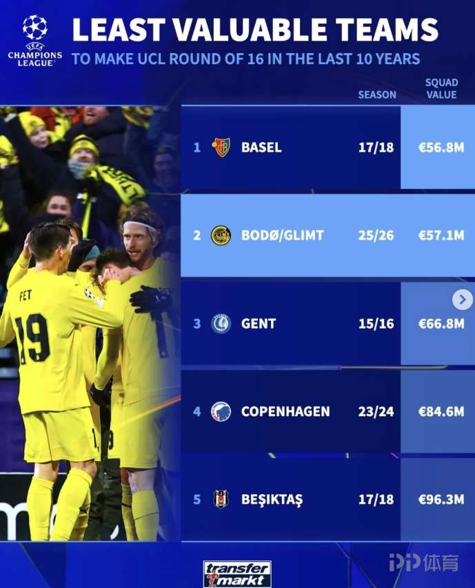 近十年欧冠16强身价最低榜:博德闪耀5710万欧排名第二 足球新闻 2026-02-26 01:43 德转统计了近十年欧冠16强身价最低榜。今天凌晨晋级16强的博德闪耀以5710万欧排名第二,仅次于17/18赛季的巴塞尔的5680万。以下是完整榜单:1. 巴塞尔(17/18赛季):5680万欧2. 博德闪耀(25/26赛季):5710万欧3. 根特(15/16赛季):6680万欧4. 哥本哈根(23/24赛季):8460万欧5. 贝西克塔斯(17/18赛季):9630万欧 责任编辑: 体育24小时热点 上一条:勒沃库森欧冠1/8决赛对手:阿森纳或拜仁 下一条:埃迪-豪:切尔西踢卡拉巴赫时双方差距不大,我们很自豪能赢