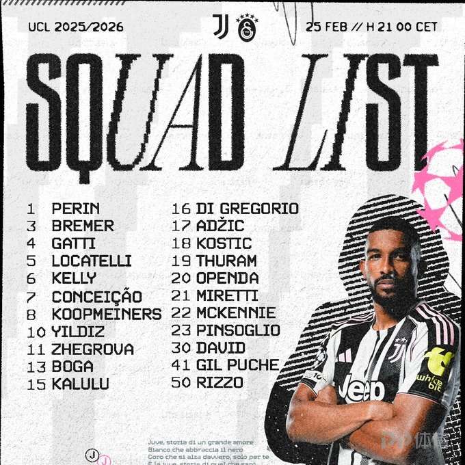 北京时间明天凌晨4点,尤文图斯将在欧冠1/8决赛附加赛次回合主场迎战加拉塔萨雷,斑马军团现在公布了比赛名单。