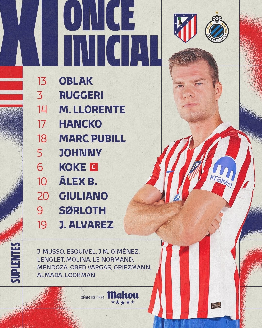 北京时间2月25日01:45,欧冠淘汰赛附加赛次回合,马德里竞技坐镇主场利雅得航空大都会球场迎战布鲁日,本场比赛主裁判为蒂尔潘,赛前双方首发出炉。