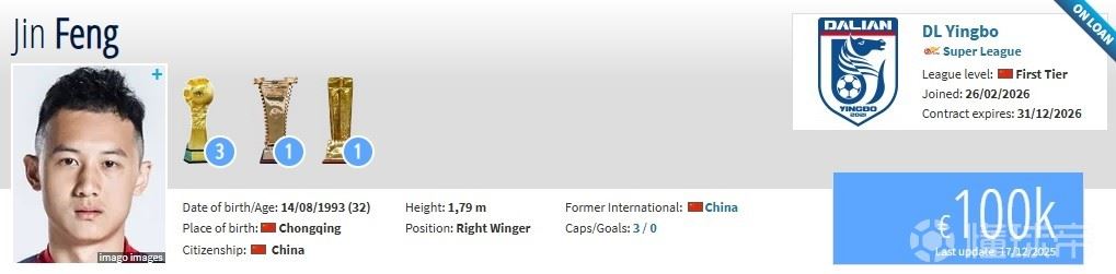 北京时间2月26日,德转更新,上海海港边锋冯劲租借加盟大连英博。
